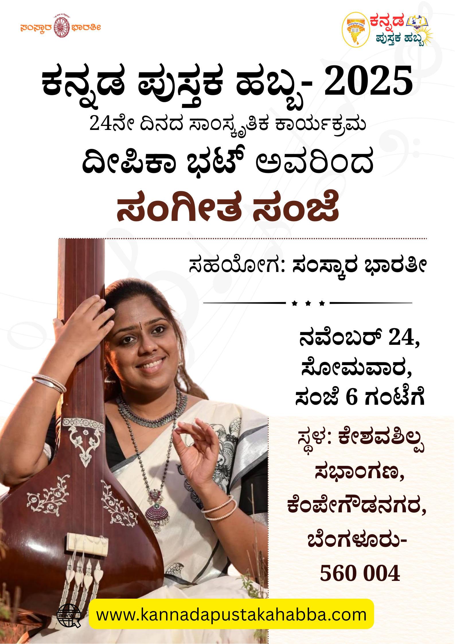 ಭಕ್ತಿಸಂಗೀತ: ಪಂಡಿತ್ ದತ್ತಾತ್ರೇಯ ವೇಲಣಕರ್-ಹಿಂದೂಸ್ತಾನಿ ದಿನಾಂಕ: ನವೆಂಬರ್ 18, 2025 ಸಮಯ: ಸಂಜೆ 6 ರಿಂದ ರಾತ್ರಿ 9 ಗಂಟೆಯವರೆಗೆ ಸ್ಥಳ- ಕೇಶವಶಿಲ್ಪ ಸಭಾಂಗಣ, ರಾಷ್ಟ್ರೋತ್ಥಾನ ಪರಿಷತ್ […]