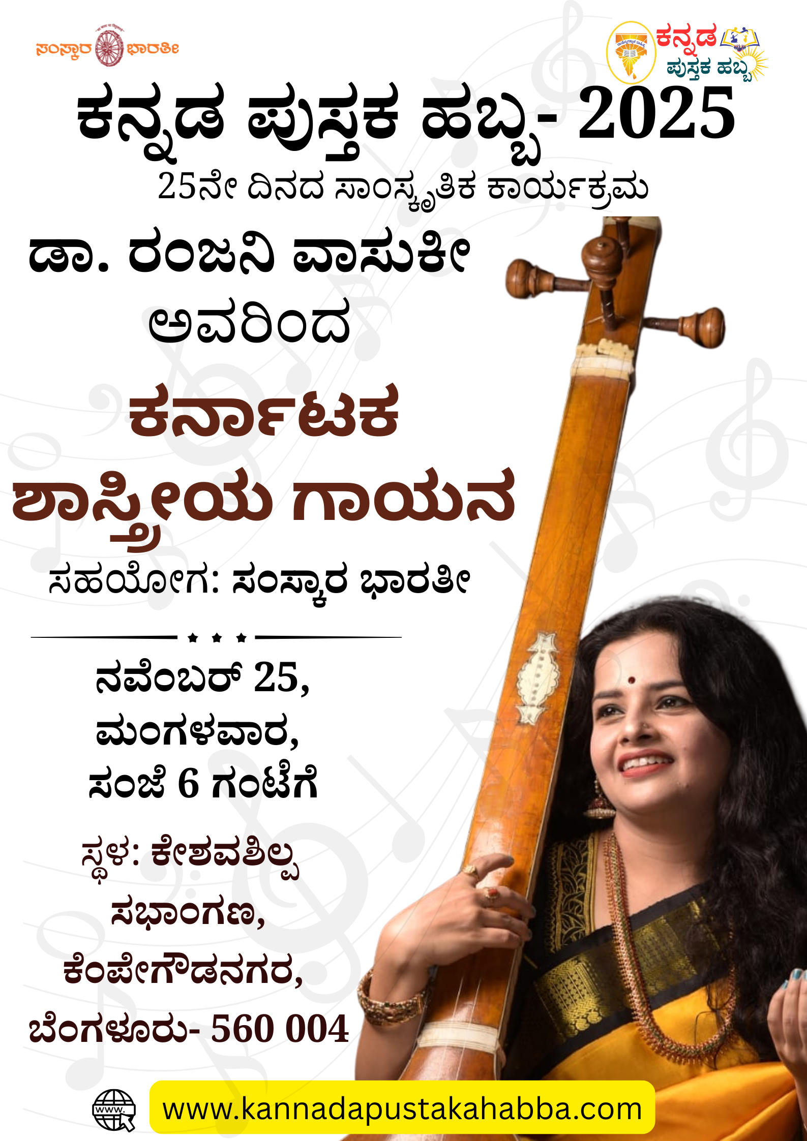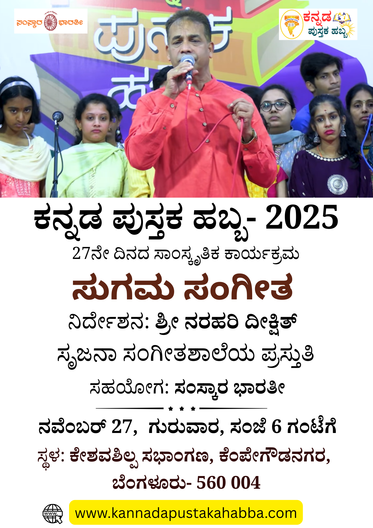 ಕನ್ನಡ ಪುಸ್ತಕ ಹಬ್ಬ 2025: ಸಂಜೆ 6 ಗಂಟೆಯಿಂದ ನರಹರಿ ದೀಕ್ಷೀತ್ ಅವರ ನಿರ್ದೇಶನದಲ್ಲಿ ಸೃಜನಾ ಸಂಗೀತಶಾಲೆಯ ವಿದ್ಯಾರ್ಥಿಗಳಿಂದ ಸುಗಮಸಂಗೀತ ಪ್ರಸ್ತುತಿ ನಡೆಯಲಿದೆ. ಸಮಯ- ಸಂಜೆ 6:00 […]