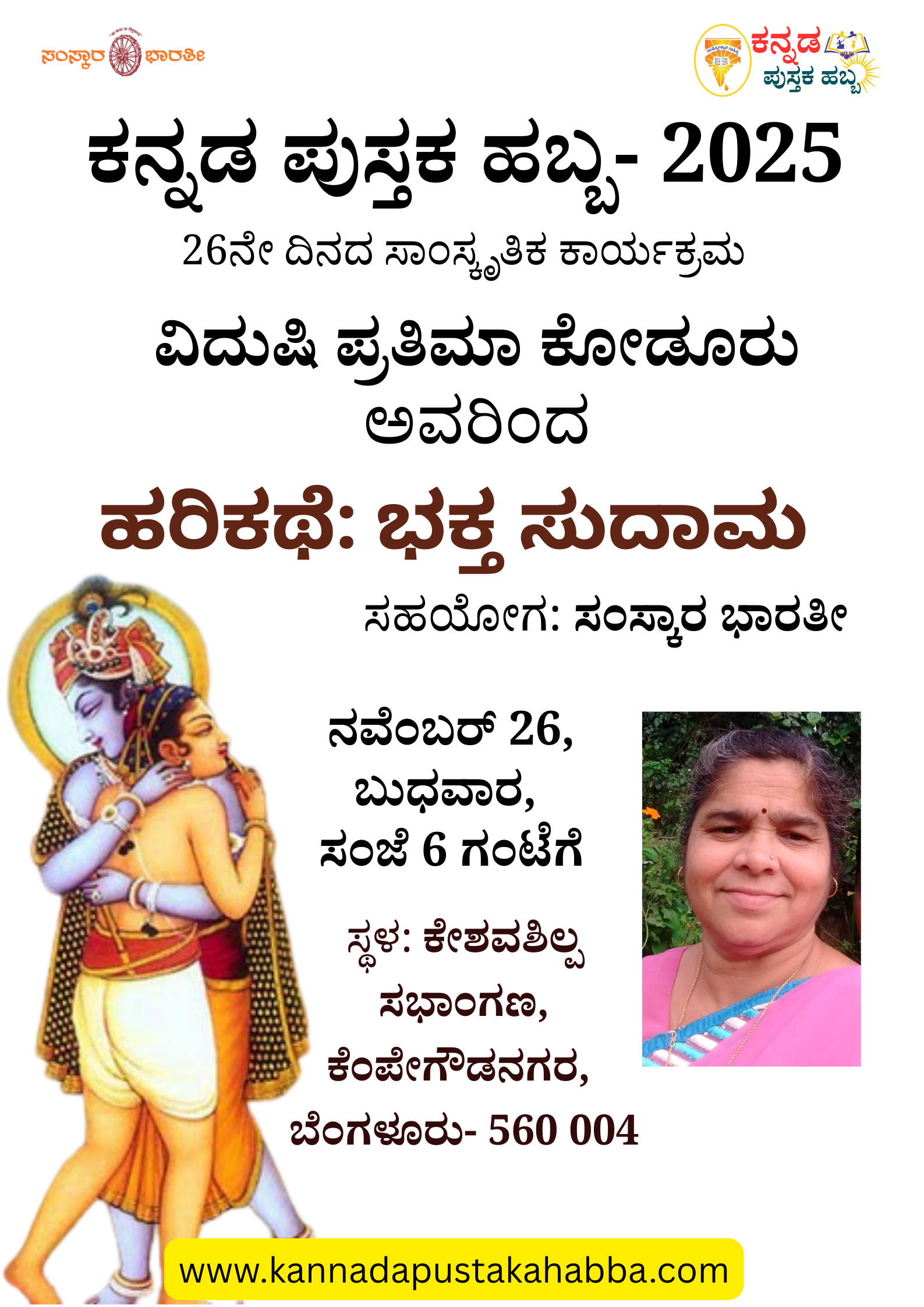 ಕನ್ನಡ ಪುಸ್ತಕ ಹಬ್ಬ 2025: ಖ್ಯಾತ ಹರಿಕಥಾ ವಿದ್ವಾಂಸರಾದ ಪ್ರತಿಮಾ ಕೋಡೂರು ಅವರು ನವೆಂಬರ್ 26, ಬುಧವಾರ ಸಂಜೆ 6 ಗಂಟೆಗೆ ಭಕ್ತ ಸುಧಾಮ ಹರಿಕಥೆ ನಡೆಸಿಕೊಡಲಿದ್ದಾರೆ. […]