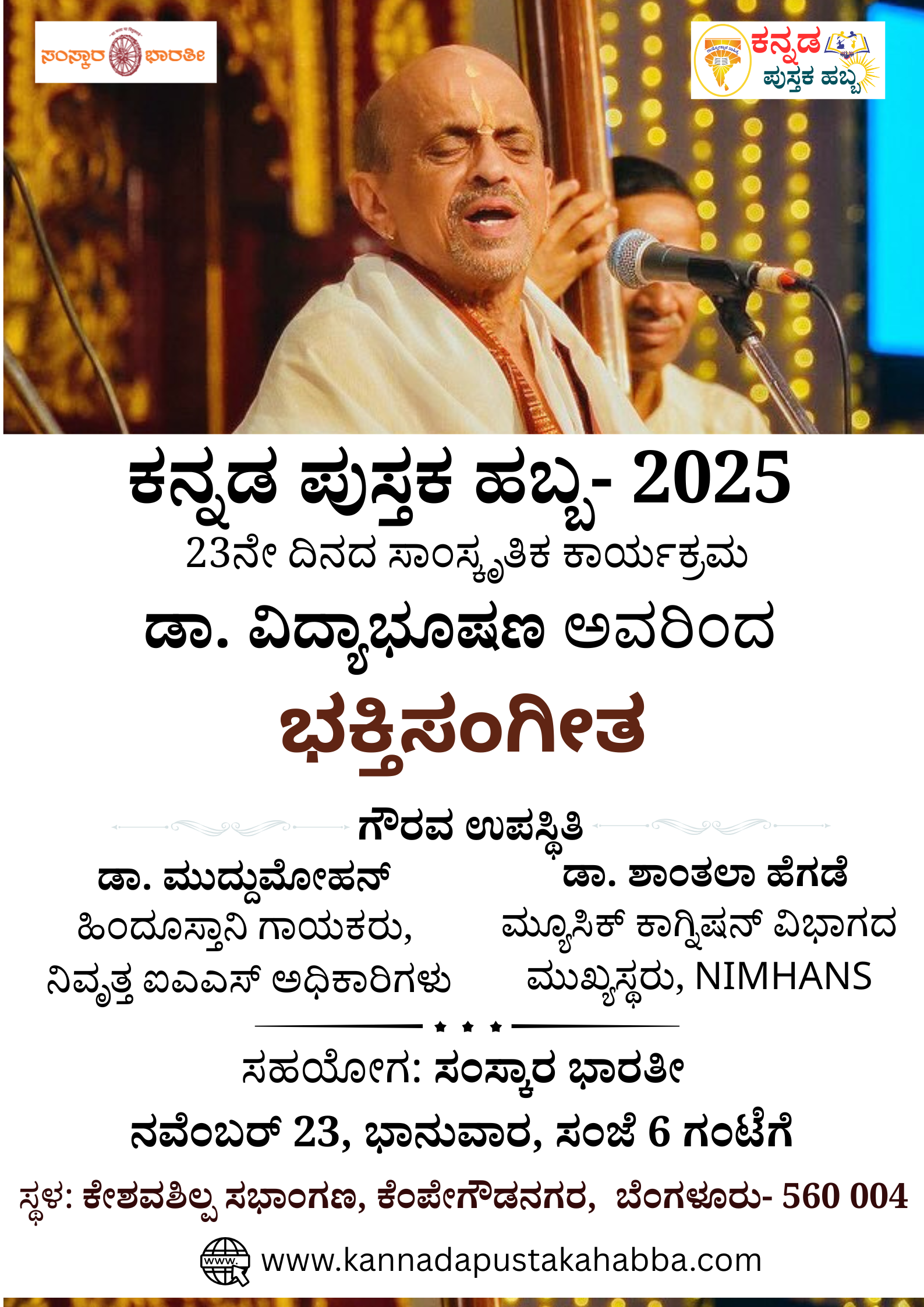 ಕನ್ನಡ ಪುಸ್ತಕ ಹಬ್ಬ 2025ರ ಬಹುನಿರೀಕ್ಷಿತ ಕಾರ್ಯಕ್ರಮಗಳಲ್ಲಿ ಡಾ. ವಿದ್ಯಾಭೂಷಣ ನಡೆಸಿಕೊಡುವ ಭಕ್ತಿಸಂಗೀತವೂ ಒಂದಾಗಿದೆ. ಶ್ರೀ ವಿದ್ಯಾಭೂಷಣರು ನಡೆಸಿಕೊಡುವ ಭಕ್ತಿಸಂಗೀತ ಕಾರ್ಯಕ್ರಮಕ್ಕೆ ಎಲ್ಲರಿಗೂ ಸ್ವಾಗತ. ದಿನಾಂಕ: ನವೆಂಬರ್ […]