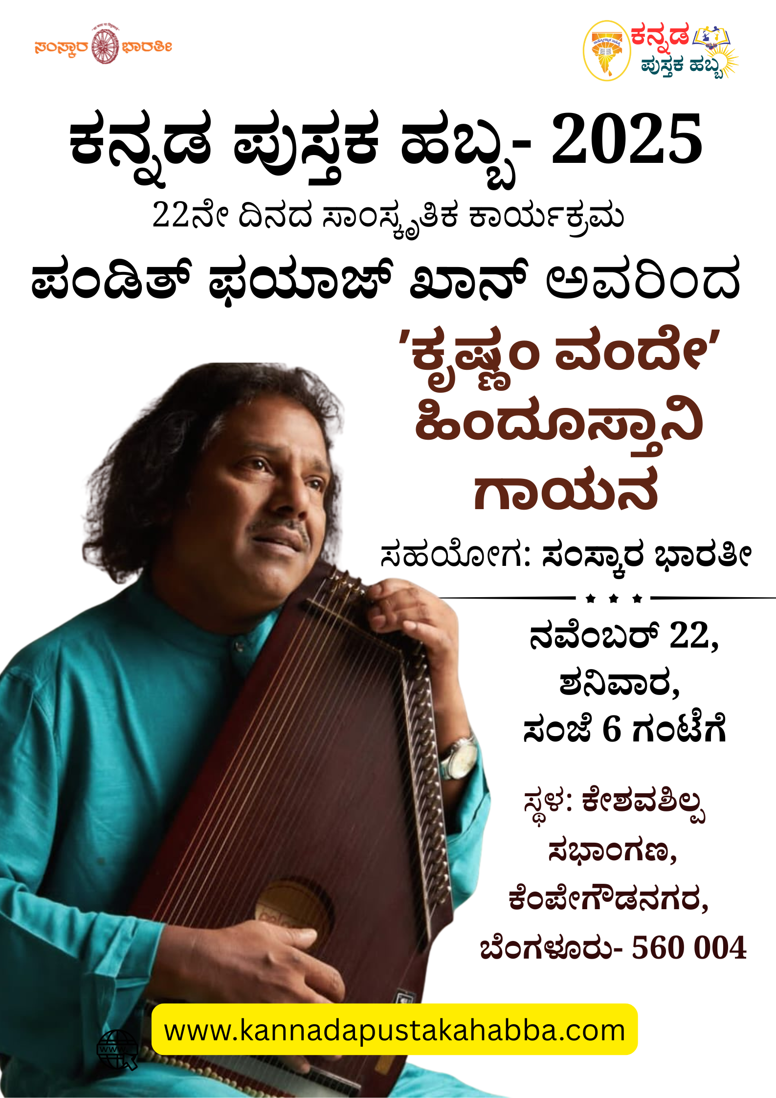 ನವೆಂಬರ್ 22ರಂದು ಹಿಂದೂಸ್ತಾನಿ ಗಾಯಕ ಪಂಡಿತ್ ಫಯಾಜ್ ಖಾನ್ ಅವರ ʼಕೃಷ್ಣಂ ವಂದೇʼ ಕಾರ್ಯಕ್ರಮ ನಡೆಸಿಕೊಡಲಿದ್ದಾರೆ. ಸಮಯ- ಸಂಜೆ 6:00 ಗಂಟೆಗೆ ಸ್ಥಳ- ಕೇಶವಶಿಲ್ಪ ಸಭಾಂಗಣ, ರಾಷ್ಟ್ರೋತ್ಥಾನ […]