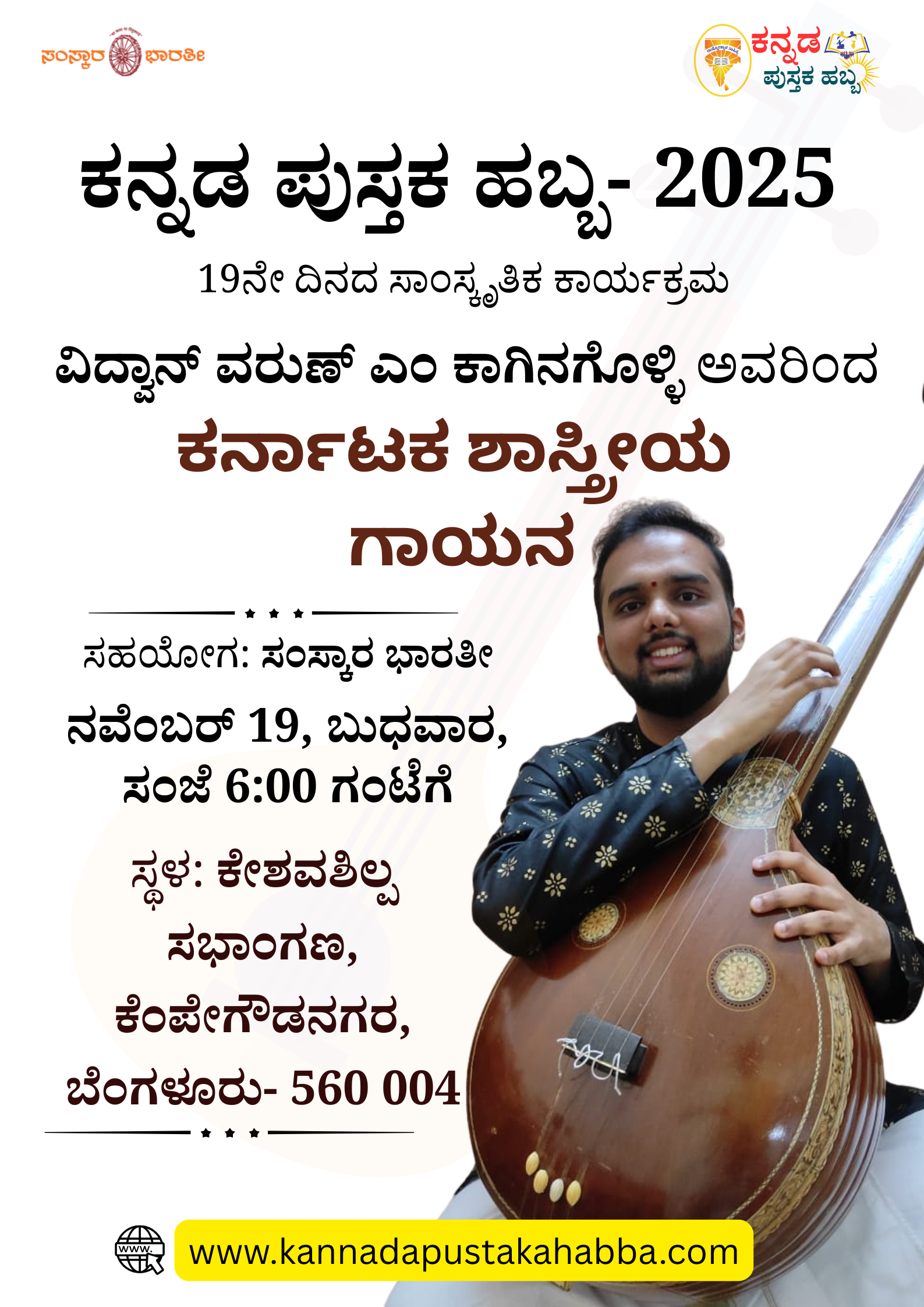 ಕನ್ನಡ ಪುಸ್ತಕ ಹಬ್ಬ 2025: ನವೆಂಬರ್ 19ರ ಬುಧವಾರ ವಿದ್ವಾನ್ ವರುಣ್ ಎಂ ಕಾಗಿನಗೊಳ್ಳಿ ಅವರಿಂದ ಕರ್ನಾಟಕ ಸಂಗೀತ ಕಾರ್ಯಕ್ರಮ ನಡೆಯಲಿದೆ. ಸಮಯ- ಸಂಜೆ 6:00 ಗಂಟೆಗೆ ಸ್ಥಳ- […]