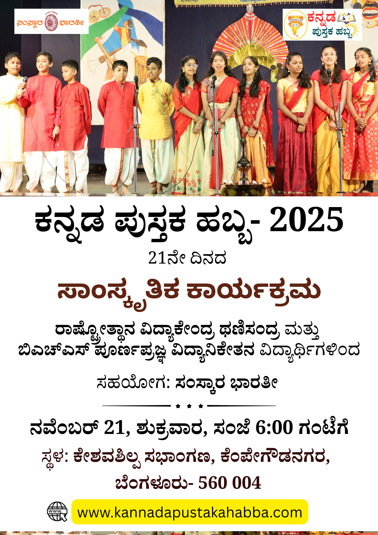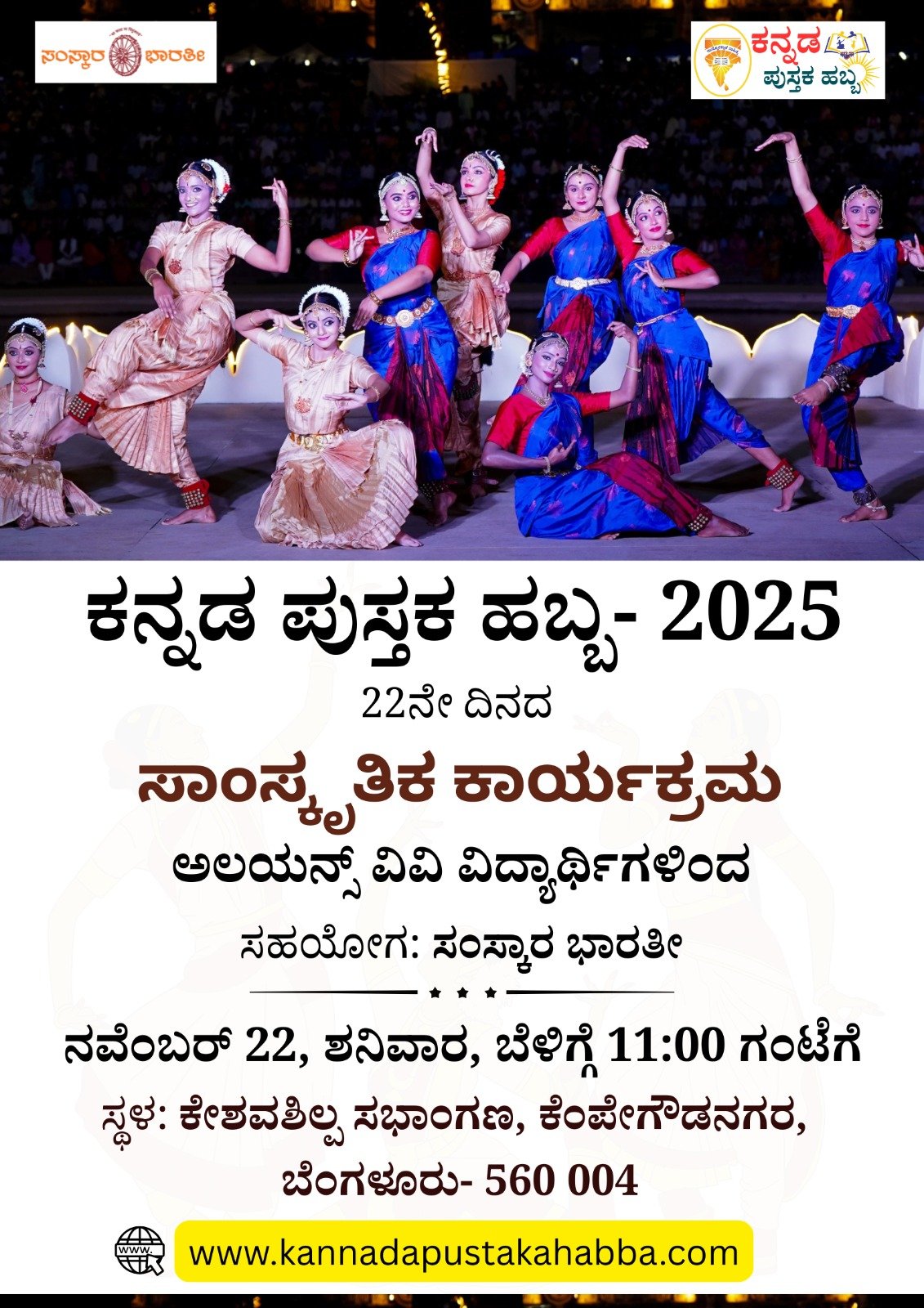 ಪುಸ್ತಕ ಹಬ್ಬದ 22ನೇ ದಿನ (ನವೆಂಬರ್ 22, ಶನಿವಾರ) ಅಲಯನ್ಸ್ ವಿ. ವಿ ವಿದ್ಯಾರ್ಥಿಗಳಿಂದ ಸಾಂಸ್ಕೃತಿಕ ಕಾಯ್ರಕ್ರಮ ನಡೆಯಲಿದೆ. ಸಮಯ- ಬೆಳಗ್ಗೆ 11:00ರಿಂದ ಸ್ಥಳ- ಕೇಶವಶಿಲ್ಪ ಸಭಾಂಗಣ, […]