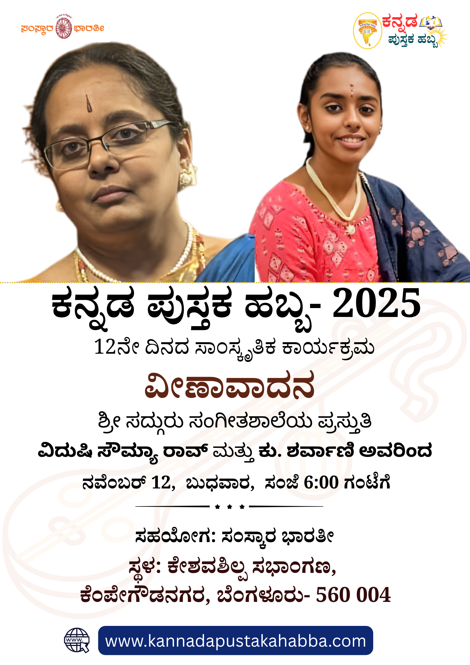ಕನ್ನಡ ಪುಸ್ತಕ ಹಬ್ಬ 2025ರ ಪ್ರಯುಕ್ತ ಬೆಂಗಳೂರಿನ ಕೇಶವಶಿಲ್ಪ ಸಭಾಂಗಣದಲ್ಲಿ ನವೆಂಬರ್ 12ರಂದು ವೀಣಾ ವಾದನ ಕಾರ್ಯಕ್ರಮವನ್ನು ವಿದುಷಿ ಸೌಮ್ಯಾ ರಾವ್ ಮತ್ತು ಕು. ಶರ್ವಾಣಿ ನಡೆಸಿಕೊಡಲಿದ್ದಾರೆ. […]