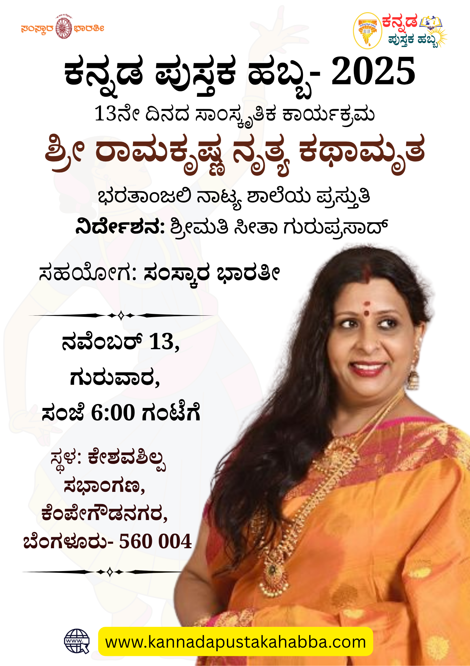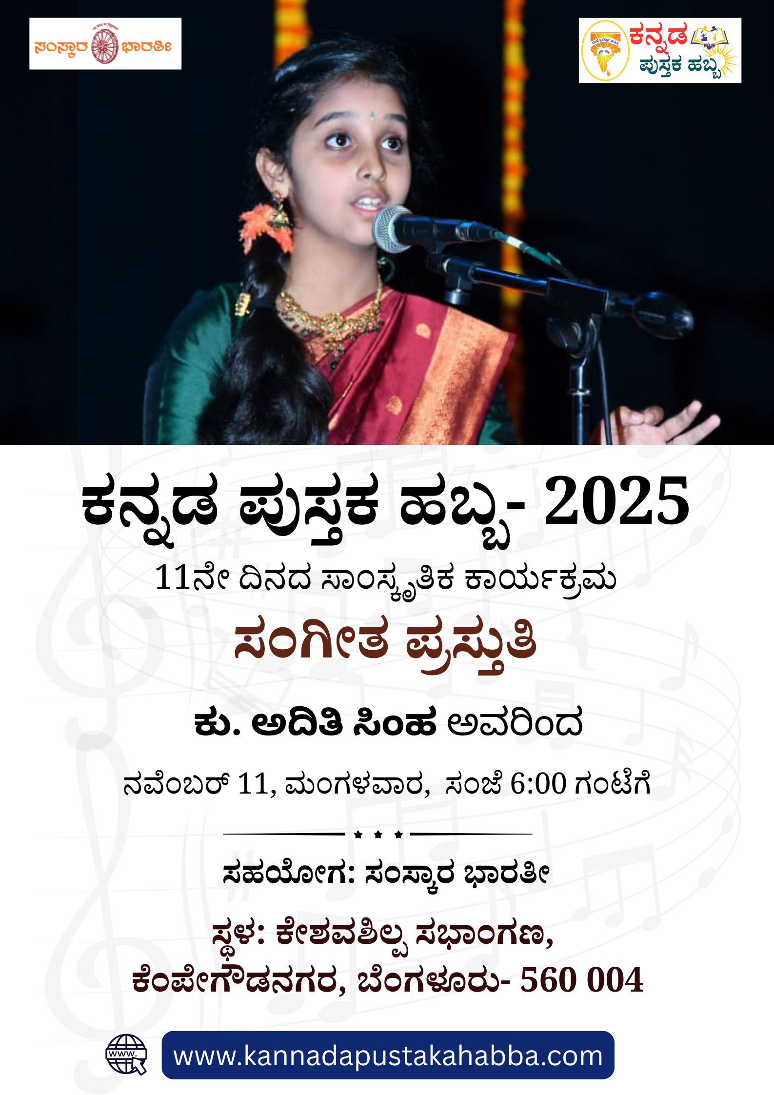 ಅದಿತಿ ಸಿಂಹ ಸಂಗೀತ ದಿನಾಂಕ: ನವೆಂಬರ್ 11 ಸಮಯ: ಸಂಜೆ 6 ರಿಂದ ರಾತ್ರಿ 7 ಗಂಟೆಯವರೆಗೆ ಸ್ಥಳ: ಕೇಶವಶಿಲ್ಪ ಸಭಾಂಗಣ, ಕೆಂಪೇಗೌಡನಗರ, ಬೆಂಗಳೂರು- 560019 ಪ್ರವೇಶ: […]