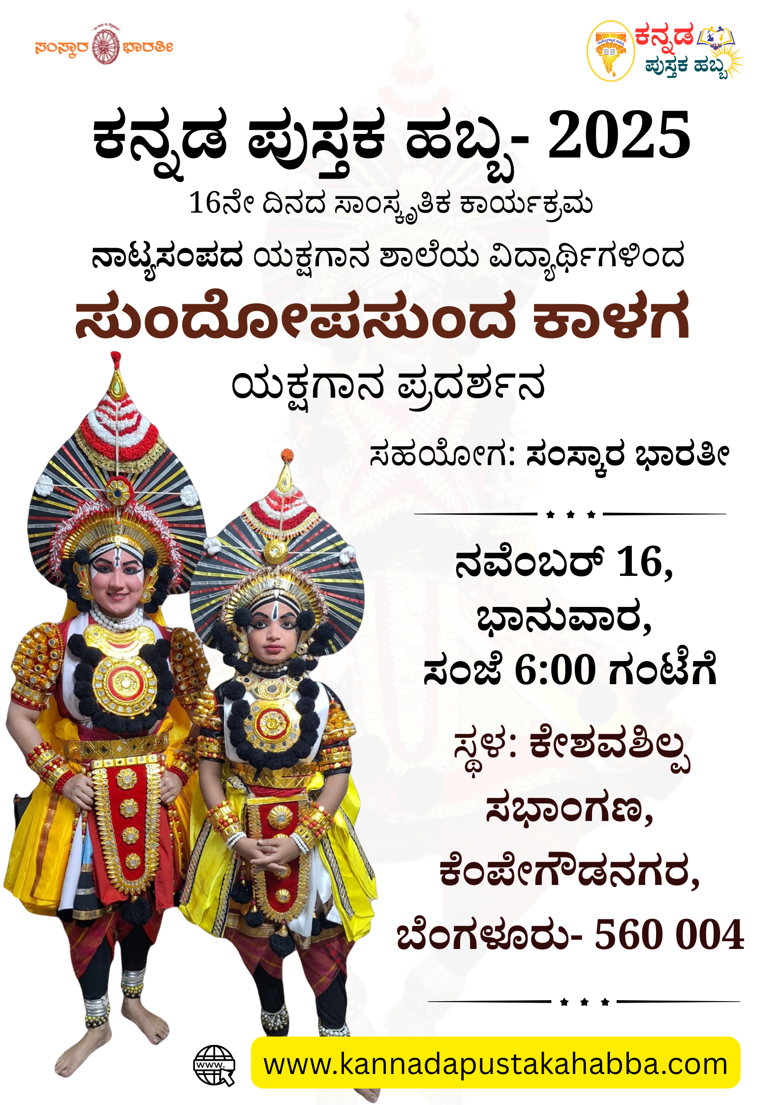 ನವೆಂಬರ್ 16: ಕನ್ನಡ ಪುಸ್ತಕ ಹಬ್ಬದ ಪ್ರಯುಕ್ತ ನಡೆಯಲಿರುವ ಸಾಂಸ್ಕೃತಿಕ ಕಾರ್ಯಕ್ರಮದ ಅಂಗವಾಗಿ 16ನೇ ದಿನ ಸಂಜೆ ನಾಟ್ಯಸಂಪದ ಶಾಲೆಯ ವಿದ್ಯಾರ್ಥಿಗಳು ಸುಂದೋಪಸುಂದ ಕಾಳಗ ಪ್ರಸಂಗವನ್ನು ಆಡಿ […]